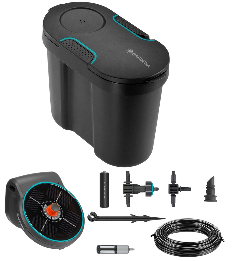O conjunto de rega AquaBloom. É um sistema solar com depósito de água ideal para varandas e terraços. Permite regar até 20 plantas sem ligação elétrica ou de água, graças ao seu painel solar, bateria recarregável, bomba integrada e depósito de 10,5 litros (ampliável). Oferece 14 programas de rega pré-definidos e pode funcionar até 12 dias de forma autónoma. É fabricado com 80% de material reciclado e o seu design moderno integra-se facilmente em espaços exteriores. É uma solução sustentável e prática para cuidar das plantas quando não está em casa. Preço: 139,95 €