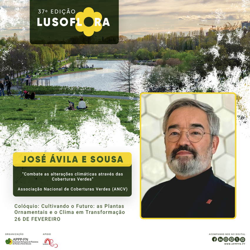 No âmbito do Colóquio “Cultivando o Futuro: as Plantas Ornamentais e o Clima em Transformação”, o Eng. Ávila e Sousa, da Associação Nacional de Coberturas Verdes (ANCV), que apresentará, no dia 26 de Fevereiro de 2026, a comunicação “Combate às Alterações Climáticas através das Coberturas Verdes”.